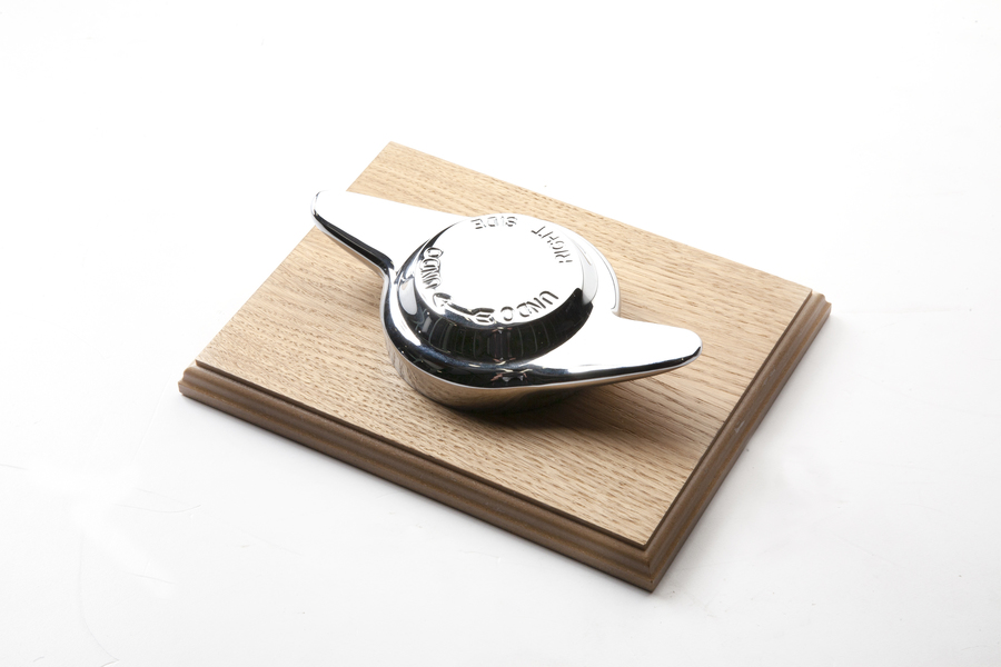 This stunning chrome plated wheel spinner as used on our world famous restoration projects is mounted on a wooden plinth to make the ultimate desk ornament for the Aston Martin enthusiast. Can also be wall mounted.